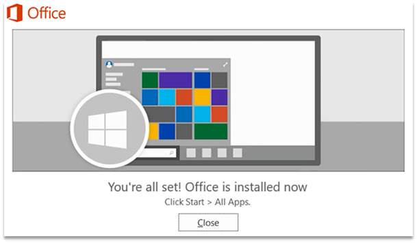 2. Your install is finished when you see the phrase, “You’re all set! Office is installed now” and an animation plays to show you where to find Office applications on your computer. Select Close.