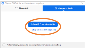 When you are happy your audio and video are working, click on join with computer audio or if you need to join via phone click on phone call, dial the number provided and enter the meeting and participant IDs when prompted