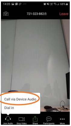 Next, tap on Call via device audio/call using internet audio You can choose to dial in however calling charges will apply if using this method – if you select dial in, all the required information for doing this will be provided on the next screen that appears.