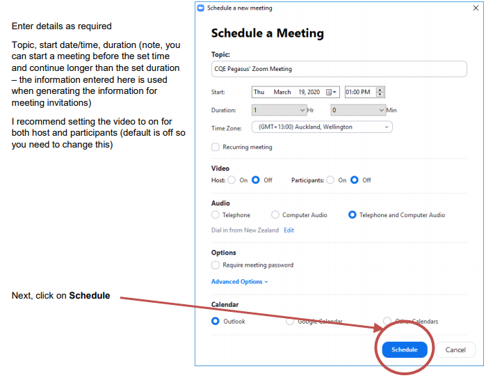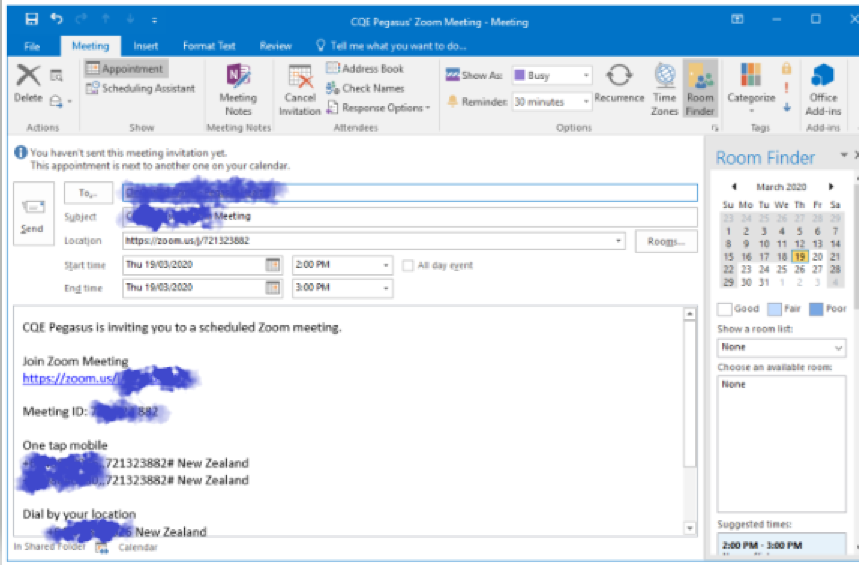 This will open an outlook meeting invitation where you can add people from you address book as usual. The location will be pre-populated with a hyperlink for people to click on to join the meeting. Meeting information will be included in the body of the invite.
